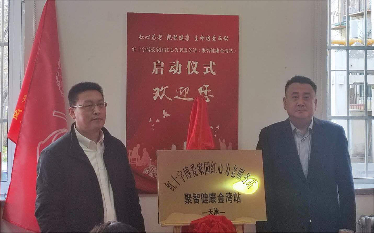 在与会嘉宾的见证下,天津市民政局养老服务处处长庞雨生与俄罗斯专享会公益基金会秘书长叶军共同为红十字博爱家园红心为老服务站聚智健康金湾站揭牌。