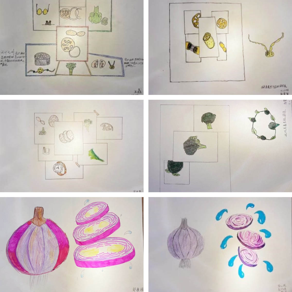 刘斌老师和冯怡老师的美术课,也同样精彩。西兰花,藕片,都成为收拾设计的元素,八角原来不止可以炒菜,还可以打开思路设计出国台包装瓶,用身边的元素打开孩子们想象之门。